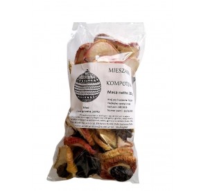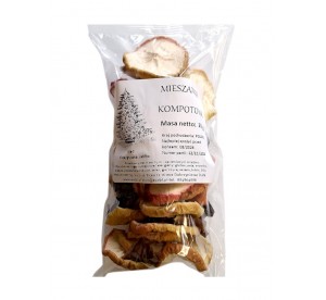 Skład: suszone owoce w zmiennych proporcjach: gruszka, śliwka (z pestką), jabłko, substancja konserwująca: sorbinian potasu, pirosiarczan sodu.