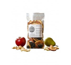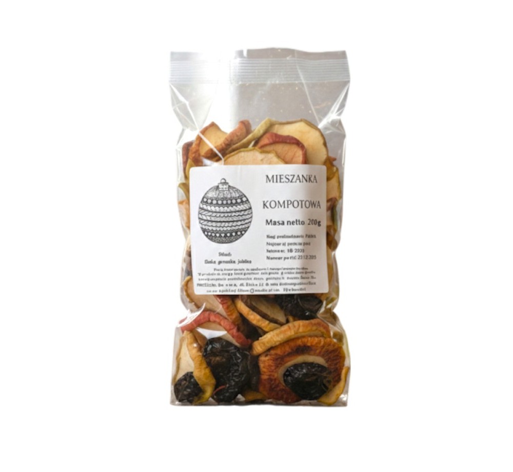 Skład: suszone owoce w zmiennych proporcjach: gruszka, śliwka (z pestką), jabłko, substancja konserwująca: sorbinian potasu, pirosiarczan sodu.