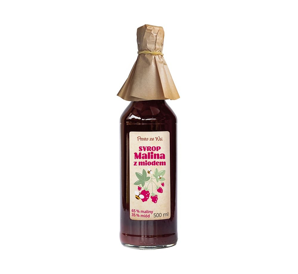 Pasteryzowany syrop malinowy z miodem pszczelim, produkowany metodą rzemieślniczą.